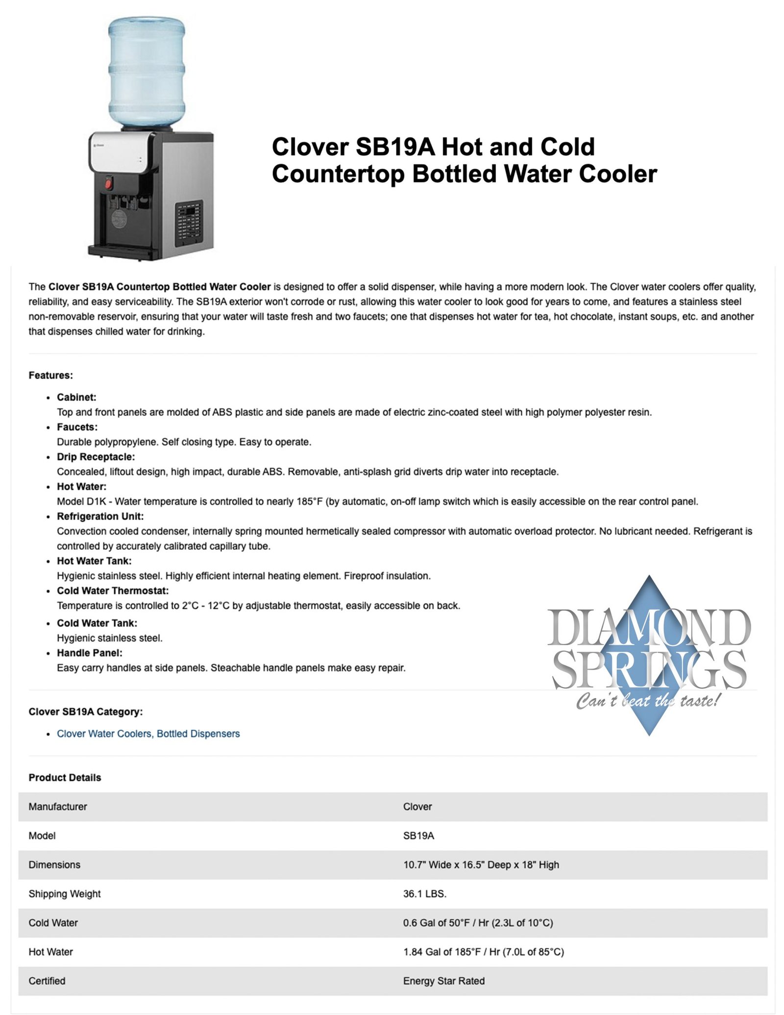 Having a superior bottled water cooler is key! Diamond Springs uses only commercial-grade, top quality bottled water coolers. Because of this, Diamond Springs water is always at a consistent temperature. Consequently, our room temperature & cold and hot & cold bottled water cooler models are perfect for warehouses, waiting rooms, kitchens or any other spot where hydration is important.