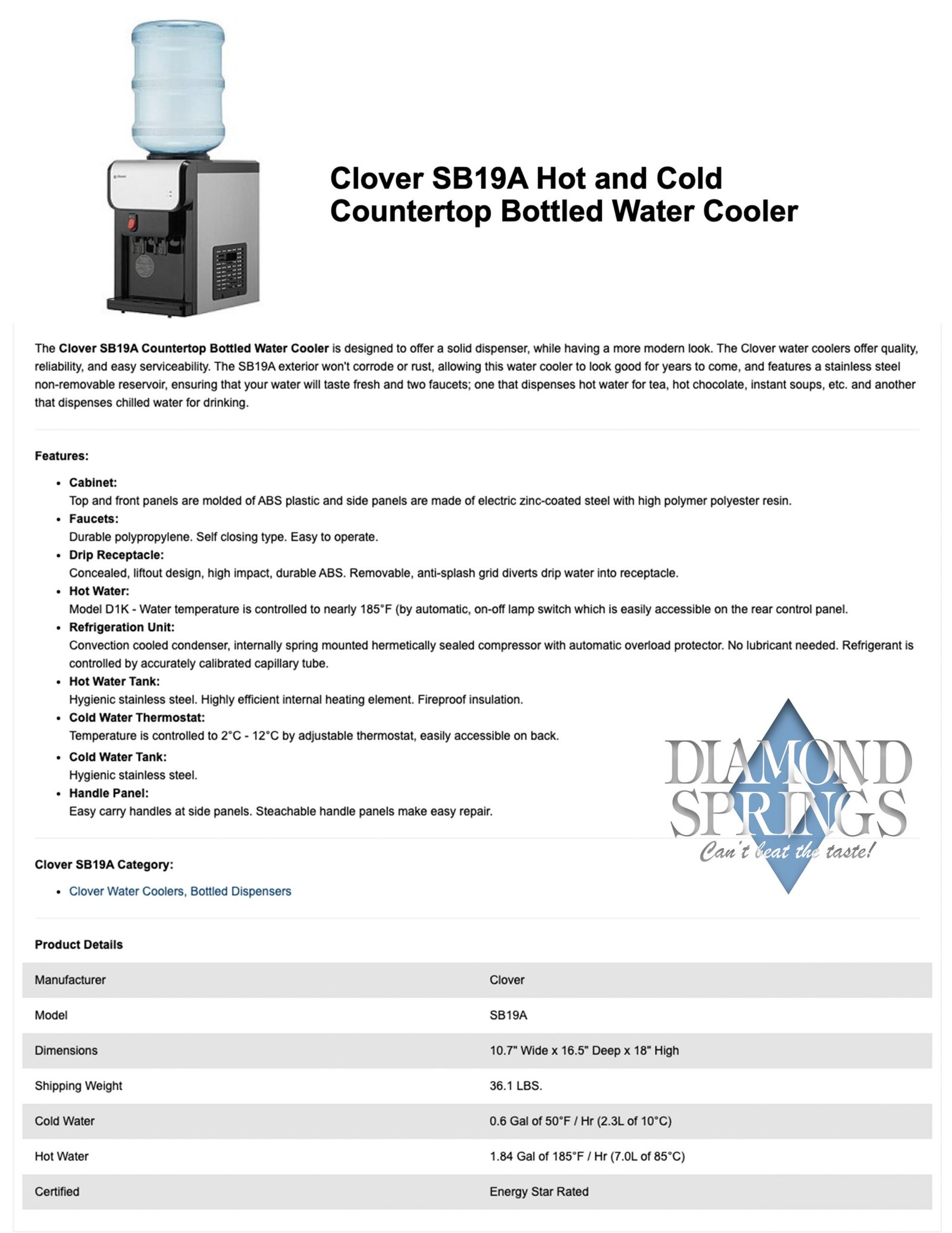 The easiest way to get started! Diamond Springs water cooler service and three 5 gallon bottles included.